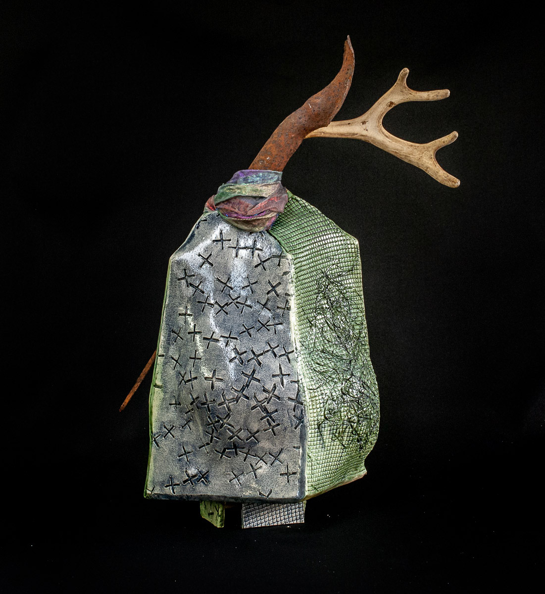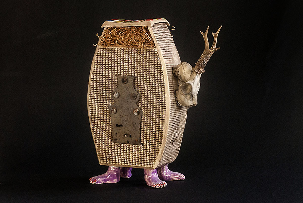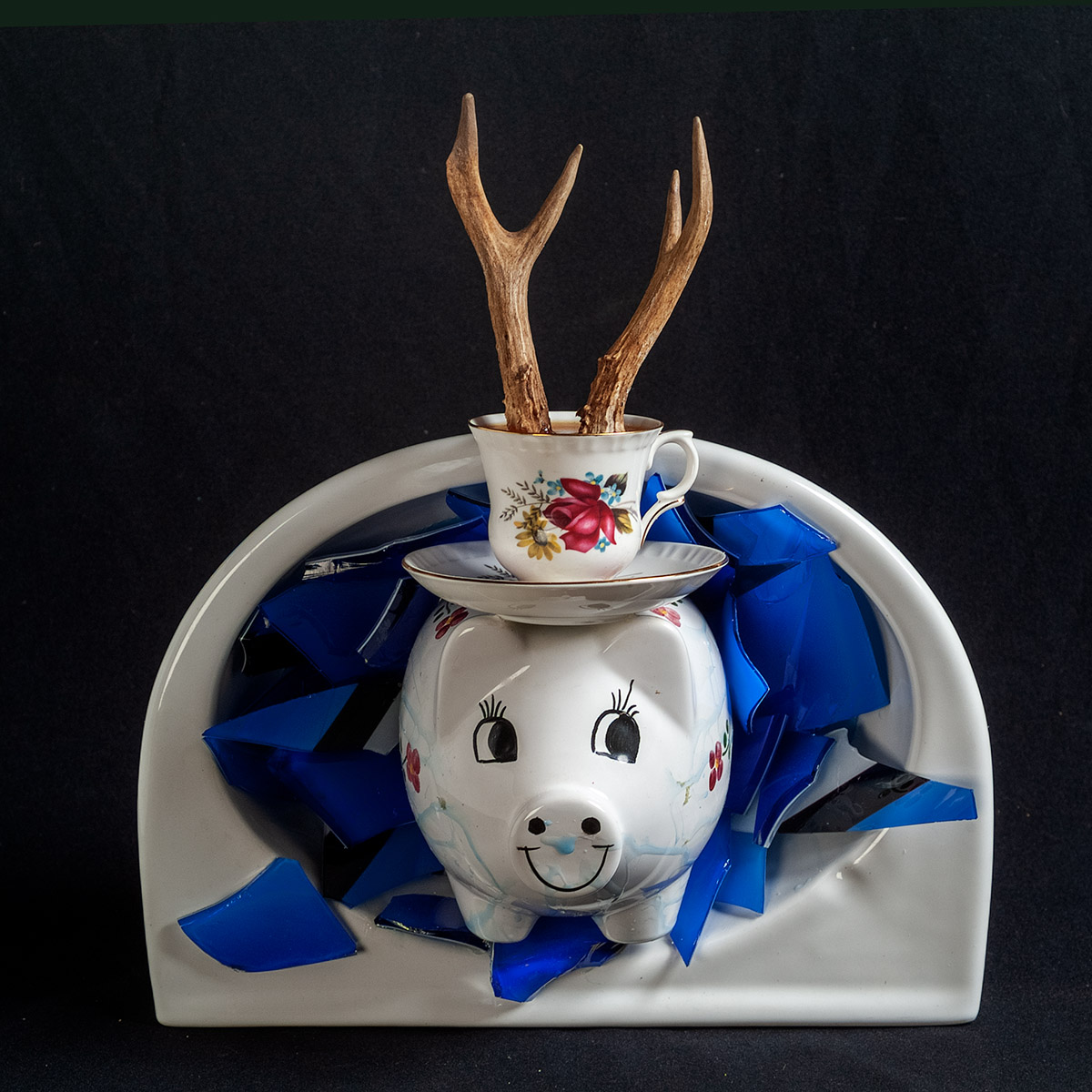 ‘Move forwards’ Keramische assemblage met gewei, oud ijzer en stof met paverpol 66 x 43 x 29 cm. 2018