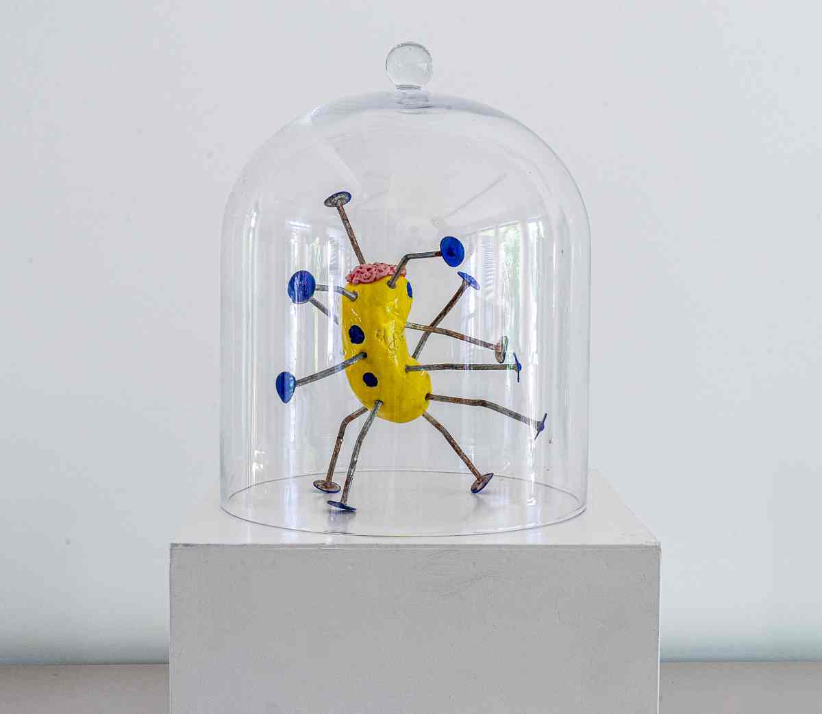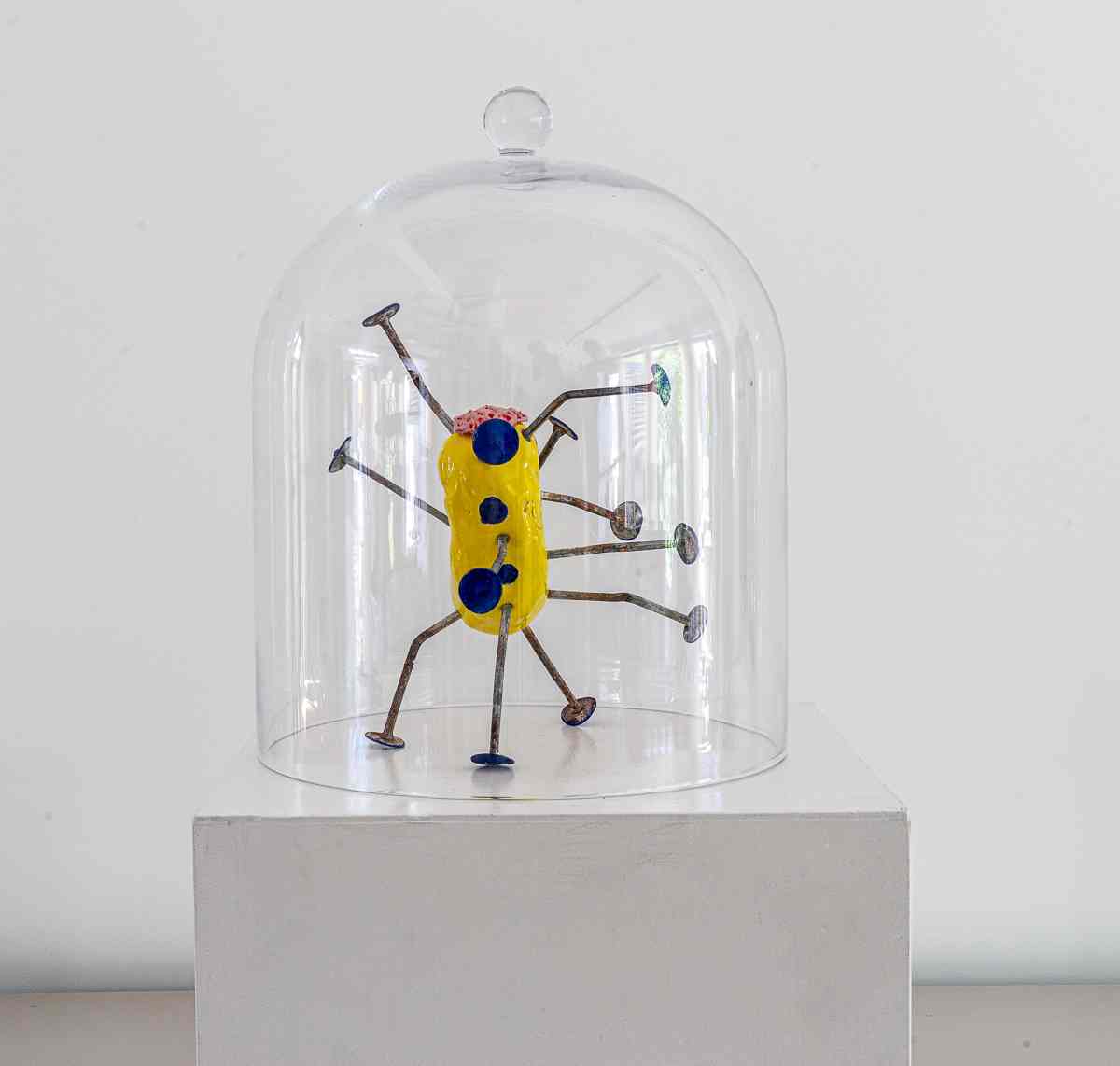 28 x 36 cm '25 Keramiek met staalspijkers en glazuur en stolp.