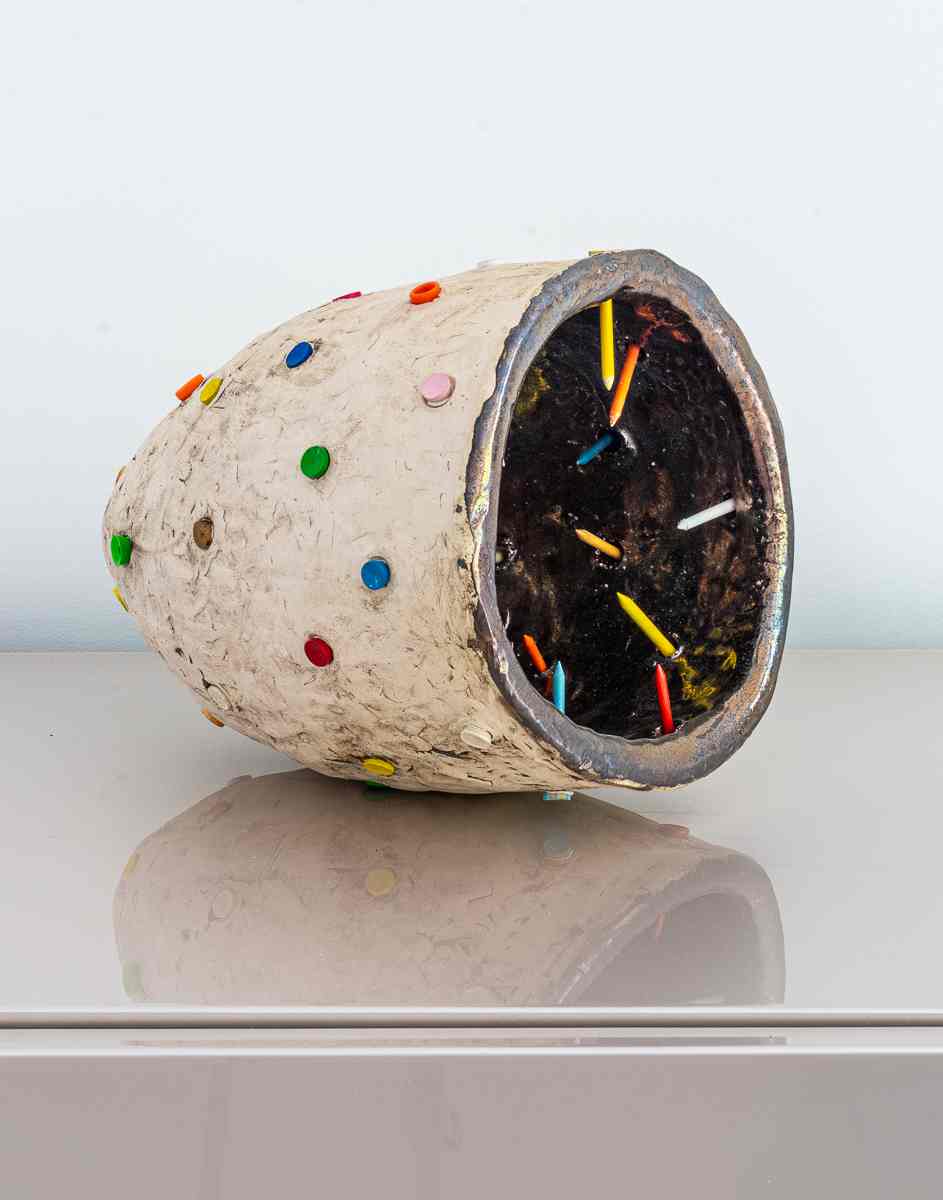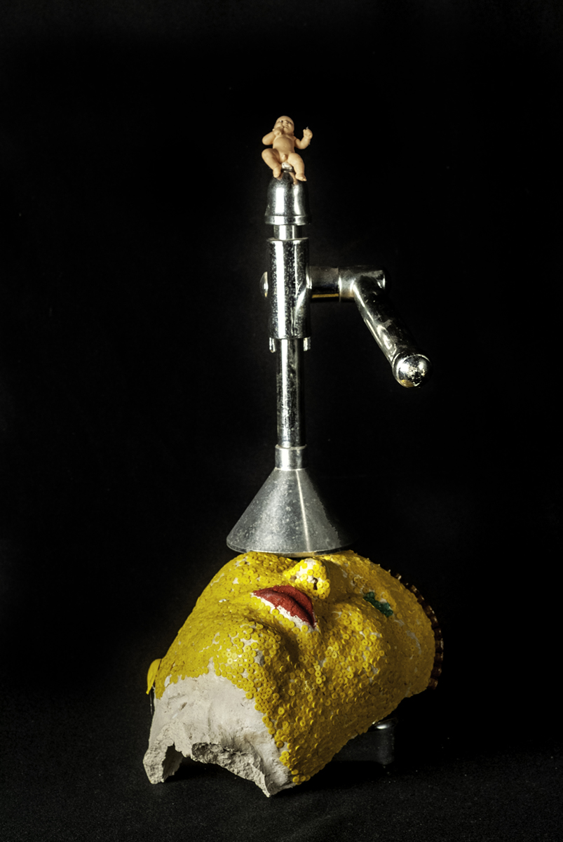 ‘Under pressure’ Keramiek met palletjes ,citruspers en baby popje 53 x 27 x 17 cm. 2012